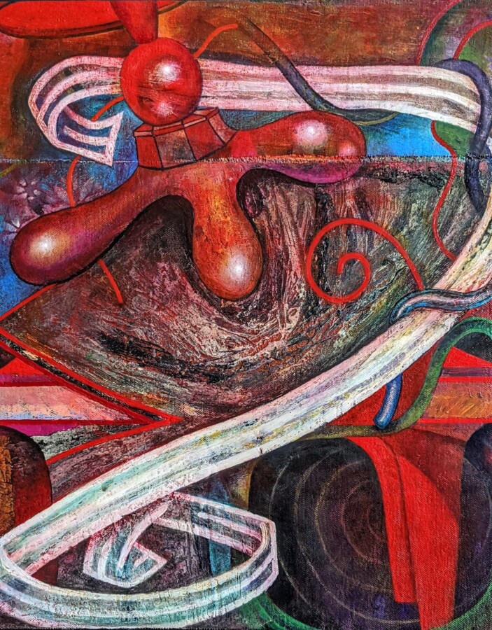 For over 40 years, Dean Habegger has focused on creating highly individualized, modern versions of still life composition. His contemporary approach to this historical genre typically features the juxtaposition of interior and exterior space set within an intriguing invented world. Dean’s still life works also incorporate a vast and colorful visual inventory of his personal symbolism, such as tables, vessels, pouring liquids, branches, sky elements, windows, fruit, ribbons, and drapery.